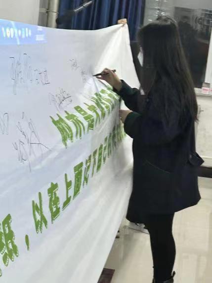 本系辅导员赵朋亮老师李倩老师和田艾迪老师、王雨生老师、胡向东老师进行签字,大家在本次活动主题的条幅上也进行签字,此次签字更激发环生青年环保意识,展现当代青年环保担当的决心,激发自己并影响和带动更多的人参与到环保事业中来,壮大中国环保工作力量。