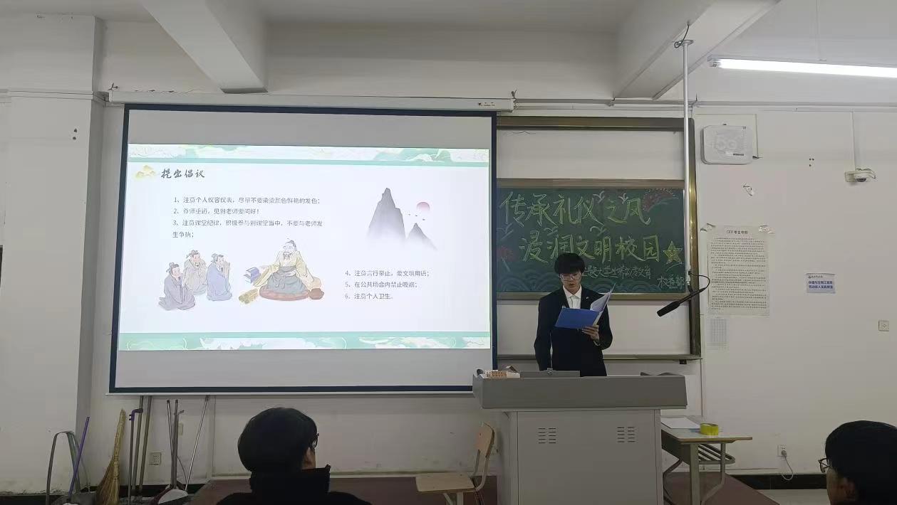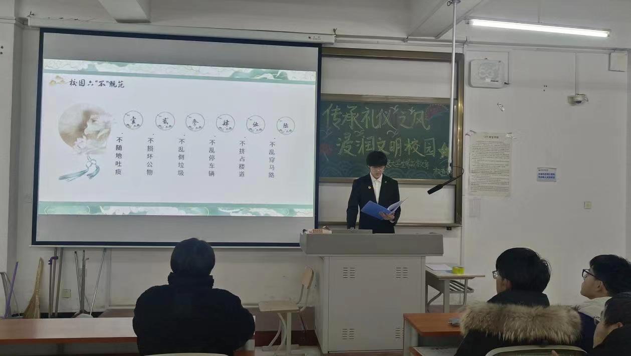为营造良好的校园氛围,规范同学的校园文明行为,我系于11月27日晚18:00举行“传承礼仪之风,浸润文化校园”—大学生养成教育会。“人生无礼则不生”文明是素养,礼仪是人际关系和谐的基础,中国是一个有着“五千年文明礼仪的大国,素来有着“礼仪之邦”的美誉。对于当代大学生来说,礼仪是我们生活中不可缺少的重要组成部分,懂礼仪,懂文明,知礼仪需要依靠我们每一个人时刻牢记严格要求文明礼仪隐藏在每一个“您”“请”“谢谢”之中隐藏在每一次微笑握手点头之内,在校园内我们更要规范自己的行为,为创造文明的校园而奋斗。在校园当中我们也经常见到很多不文明的行为,我们应该规范自己,告诫他人,为创造美丽校园而奋斗。本次大会由高喆为同学们进行演讲,分为四个部分,并且让同学进行朗读,让同学们认识到文明的重要性。