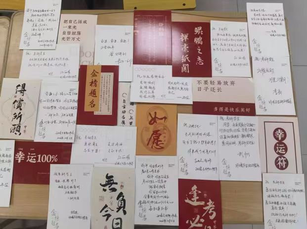 考研学生们扎消极词汇气球、系内学生写祝福话语、贴金榜题名留言贴、钉师生祝福明信片,营造校图书馆温馨、励志的环境氛围,给予考研学子支持、鼓励,帮助疏解考研学子学习压力,陪伴和助力考研学子更好度过考研时光。