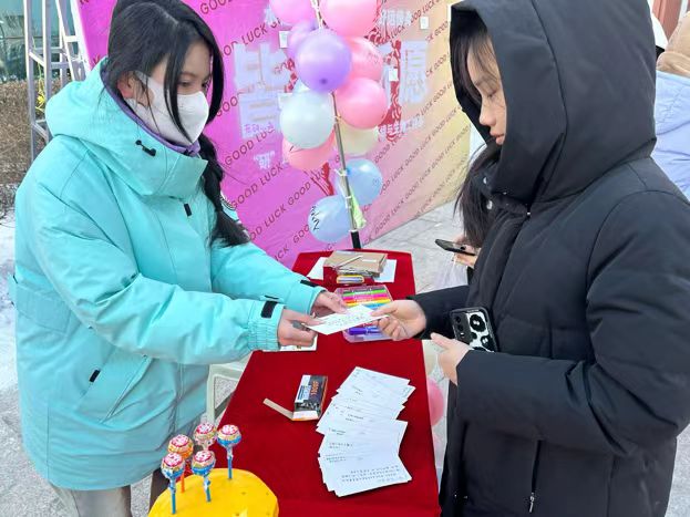 辅导员赵朋亮老师带领系内老师在图书馆二楼为考研学生送上礼物,小小礼物寓意满满。一件件贴心的礼物,一句句真切的话语,给这冬天增添色彩,给予同学们最美好的祝福。让考研学子深深感受到了学校的爱与温暖,备受鼓舞、动力满满。