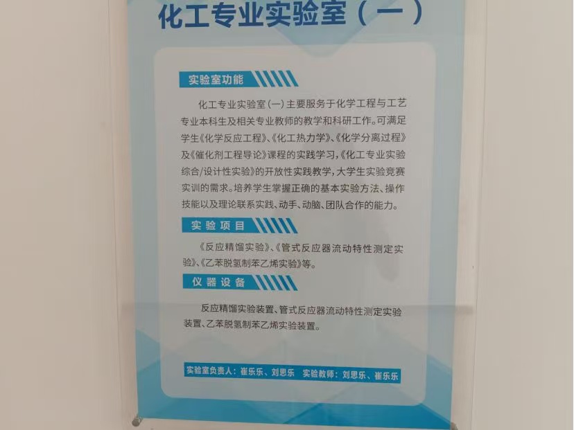 化专业实验室是为化学工程与工艺专业提供实验教学和科学研究的重要基地。它配备了多种实验设备,如管式反应器实验装置、反应精馏实验装置、乙苯脱氢实验装置等。这些实验项目与所学专业课紧密结合,使学生更好的理论联系实践,并培养学生动手、动脑及团队合作能力。本实验室还承担了部分毕业论文的实验工作,为进一步提高学生的就业能力提供基础。化工专业实验室经过近十年的发展和建设,目前已拥有4套管式反应器实验装置,4套反应精馏实验装置,4套乙苯脱氢实验装置,年均接纳学生近百人。