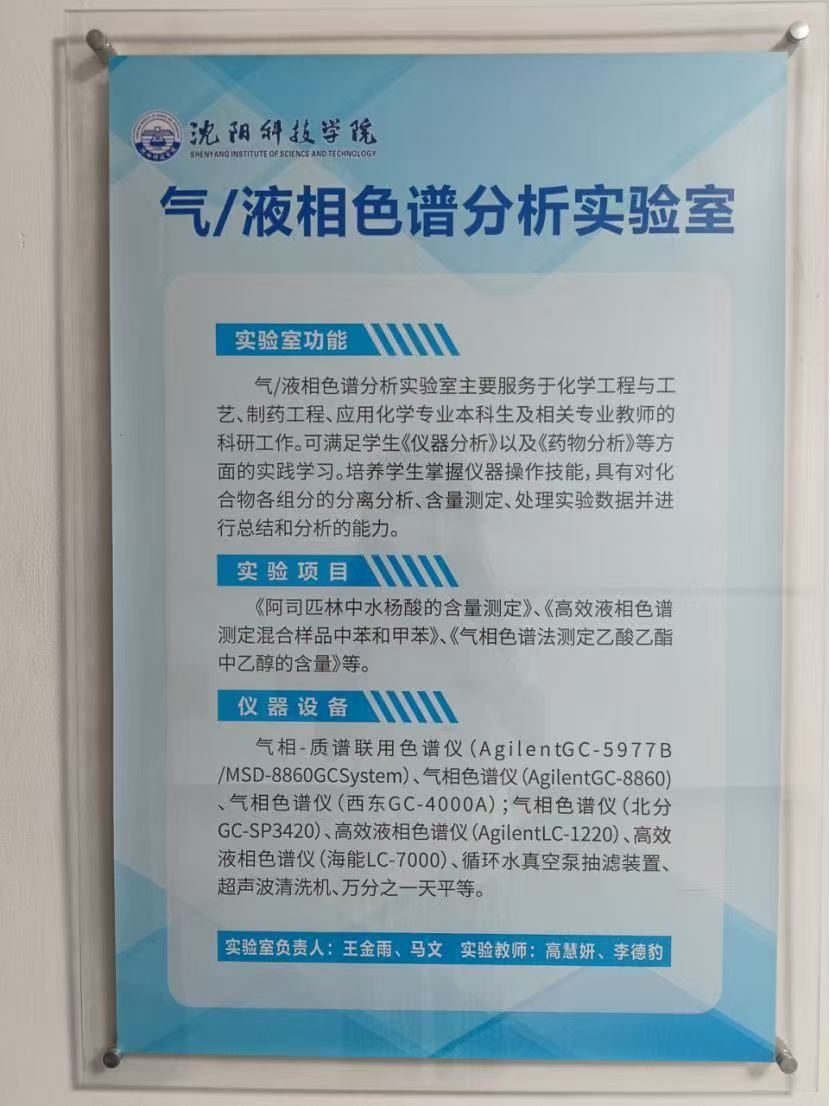 /液相色谱分析实验室主要服务于化学工程与工艺、制药工程、应用化学专业本科生及相关专业教师的科研工作。可满足学生《仪器分析》以及《药物分析》等方面的实践学习。培养学生掌握仪器操作技能,具有对化合物各组分的分离分析、含量测定、处理实验数据并进行总结和分析的能力。