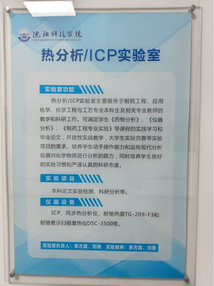 实验室功能:热分析/ICP实验室主要服务于制药工程、应用化学、化学工程与工艺专业本科生及相关专业教师的教学和科研工作。可满足学生《药物分析》、《仪器分析》、《制药工程专业实验》等课程的实践学习和毕业论文,开放性实践教学,大学生实验竞赛等实验项目的需求。培养学生动手操作能力和运用现代分析仪器对化学物质进行分析的能力,同时培养学生良好的实验习惯和严谨认真的科研态度,