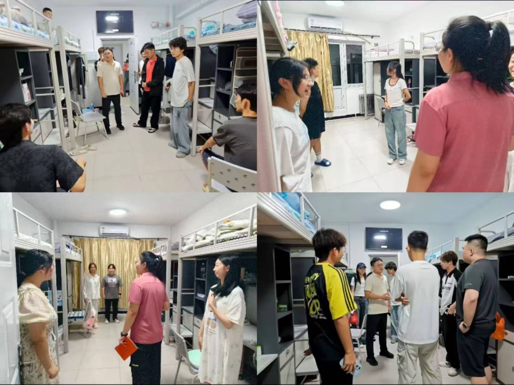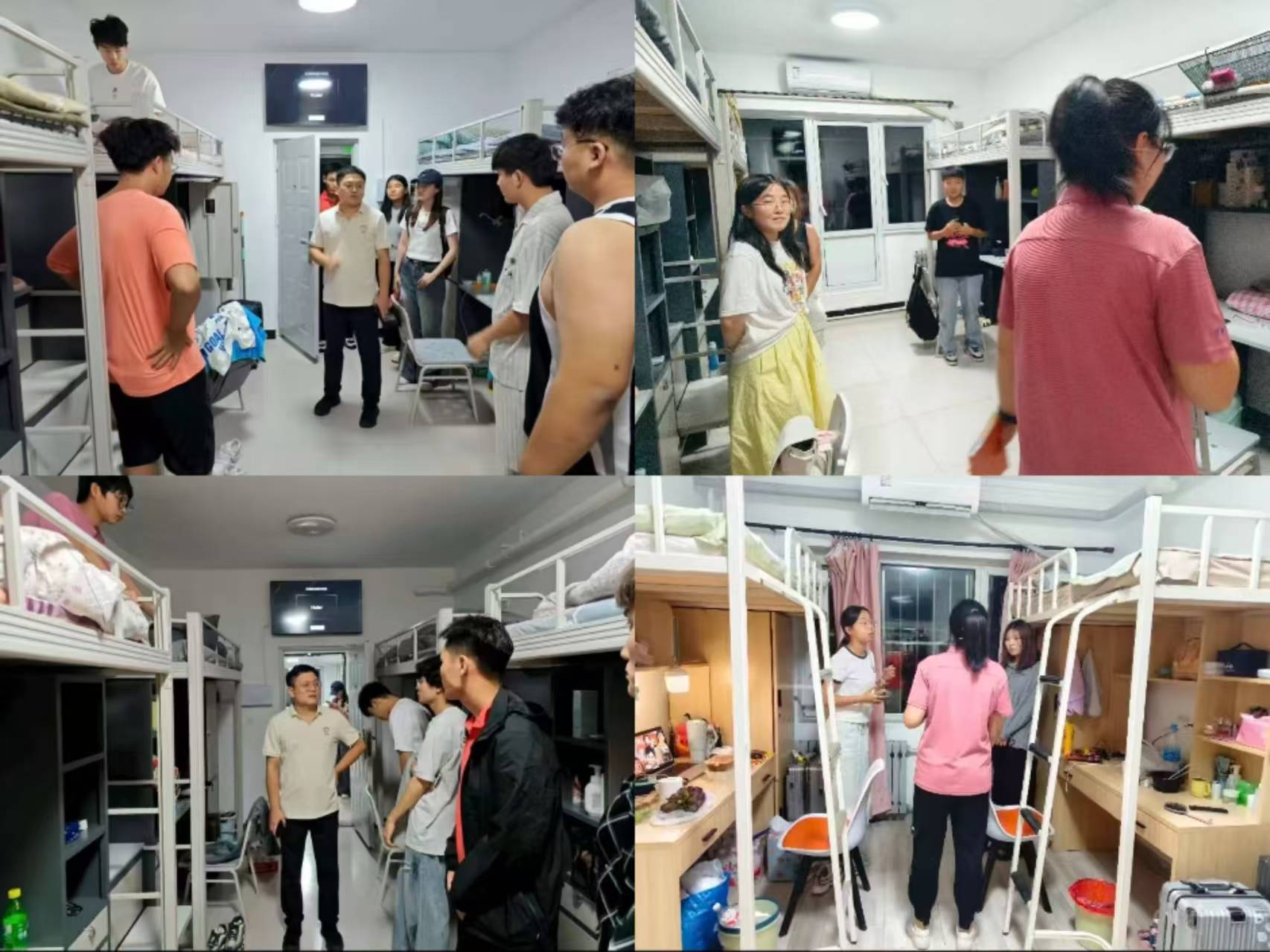 走访过程中,辅导员老师们与新生们进行了亲切友好的交流,细致地了解了同学们的生源来源、入学后的感受、饮食习惯的适应情况以及宿舍设施的使用状况,耐心解答了同学们关于专业学习、校园生活、社团活动等方面的疑问。