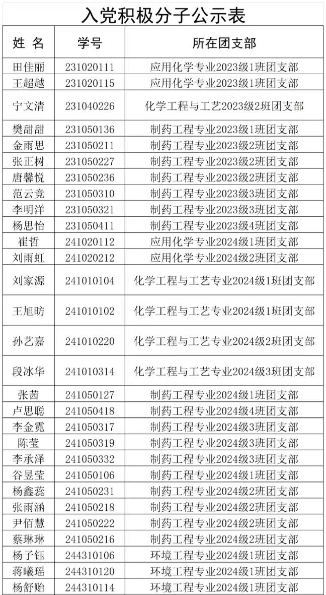 按照发展党员工作相关规定,经共青团推优、支部委员会(支部大会)研究,同意将田佳丽等31名同学确定为入党积极分子。根据发展党员工作有关要求,现将其有关情况公示如下: