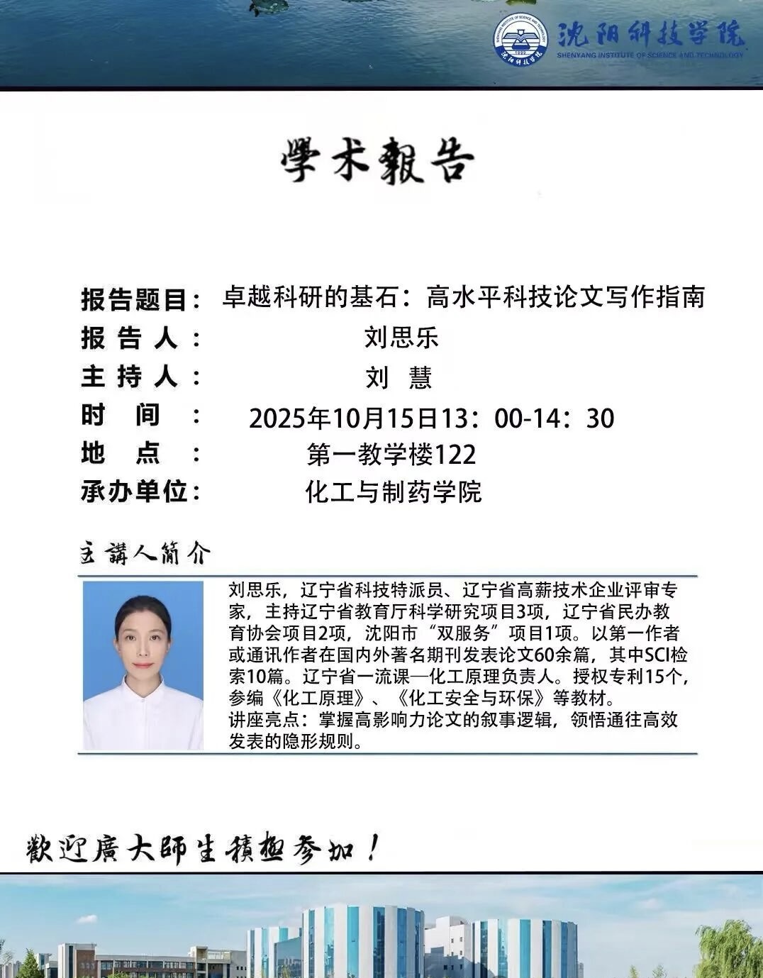 刘思乐,辽宁省科技特派员、辽宁省高薪技术企业评审专家,主持辽宁省教育厅科学研究项目3项,辽宁省民办教育协会项目2项,沈阳市“双服务”项目1项。以第一作者或通讯作者在国内外著名期刊发表论文60余篇,其中SCI检索10篇。辽宁省一流课—化工原理负责人。授权专利15个,参编《化工原理》、《化工安全与环保》等教材。