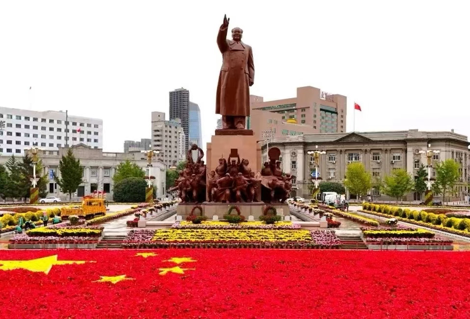 沈阳中山广场的毛泽东雕像群,主席塑像高举手臂指引方向,工农兵群雕环绕。红毯花海配和平鸽,历史与现代交融,是城市的精神地标,见证信仰与初心的传承。