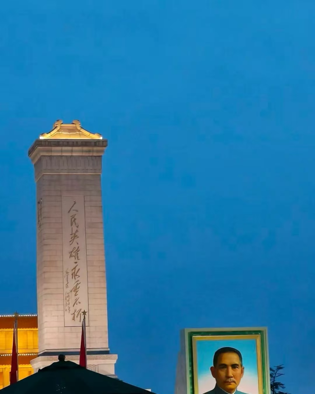 暮色中的人民英雄纪念碑庄严肃穆,“人民英雄永垂不朽”的碑文熠熠生辉。旁侧孙中山先生画像矗立,二者交织,既缅怀革命先烈的牺牲奉献,又传承先驱者的救国理想,是历史与精神的双重地标。