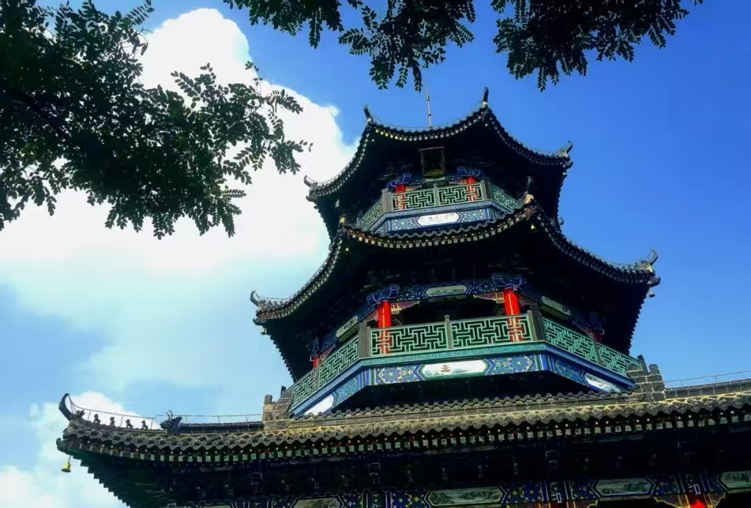 蓝天绿树间,古楼阁飞檐翘角,彩绘斑斓。它如时光的容器,承载着传统建筑的精巧工艺,在一方天地里,静静诉说着历史的韵味与文化的厚重。