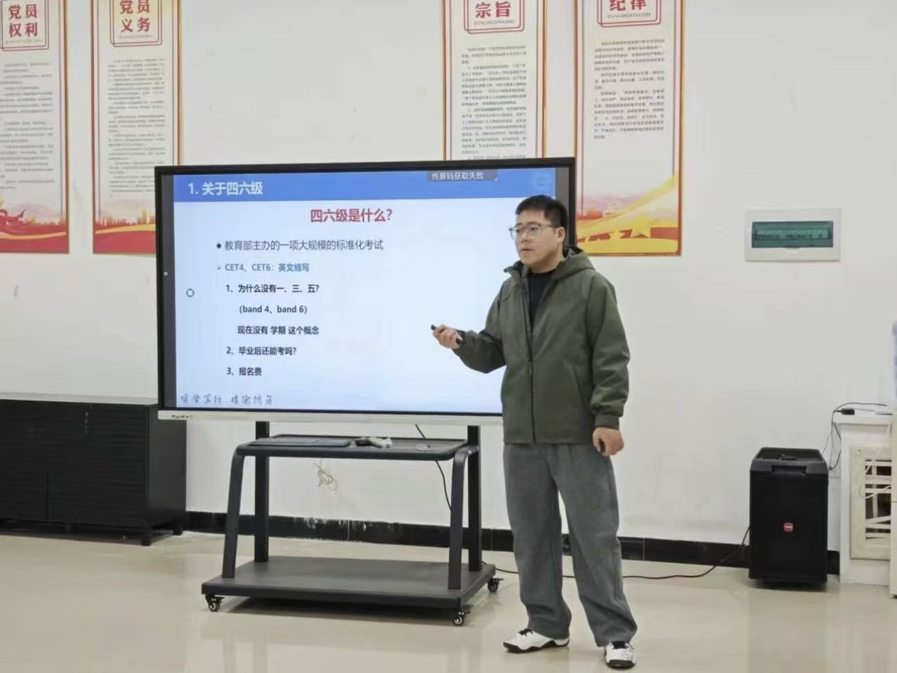11月12日,学院教师高国铸在星海社区开展了“四六级备考复习答疑与冲刺技巧专场”专题讲座。讲座聚焦四六级备考的答题技巧,旨在帮助学生复习答疑与短时间的冲刺。