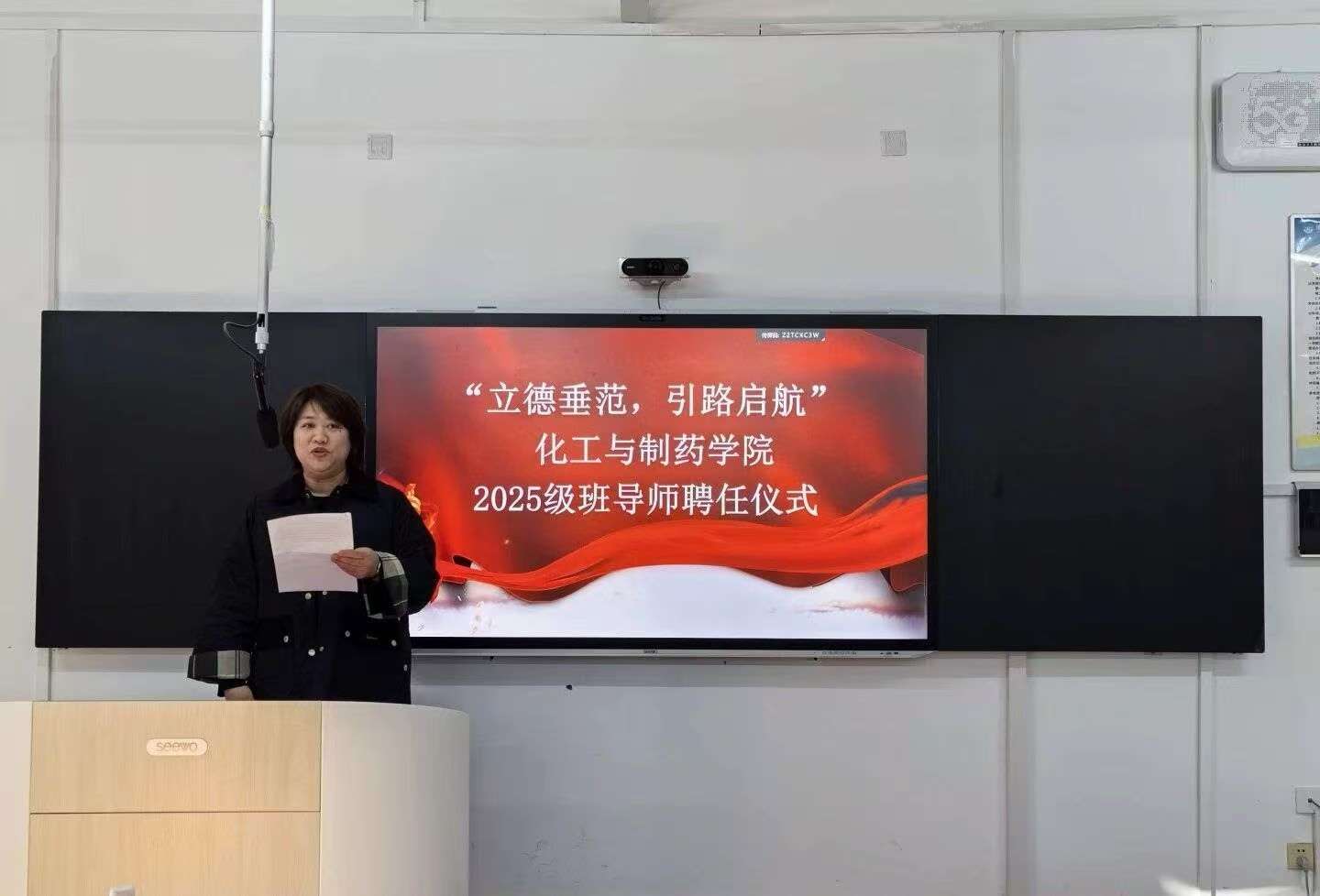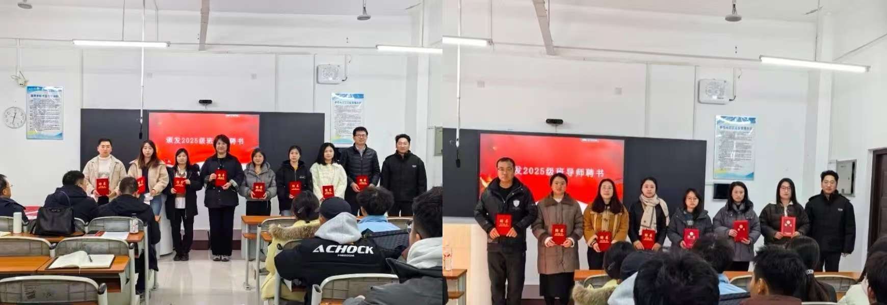 在庄重的聘任环节,都颖书记宣读聘任决定后,班导师依次上台,由学生处副处长李松颁发聘书。红底金字的聘书,承载着沉甸甸的信任与期许。