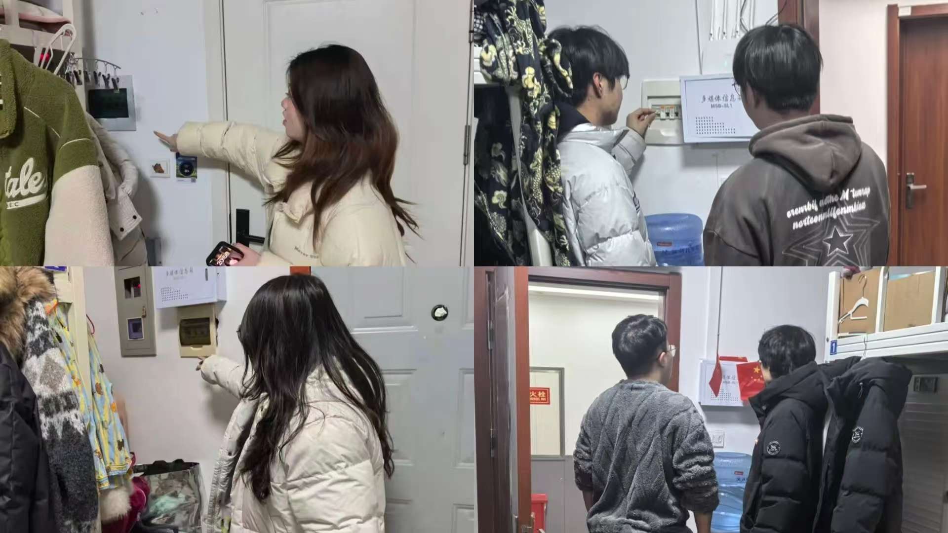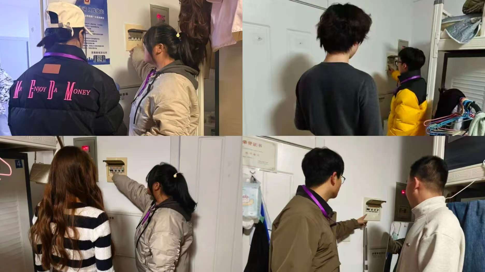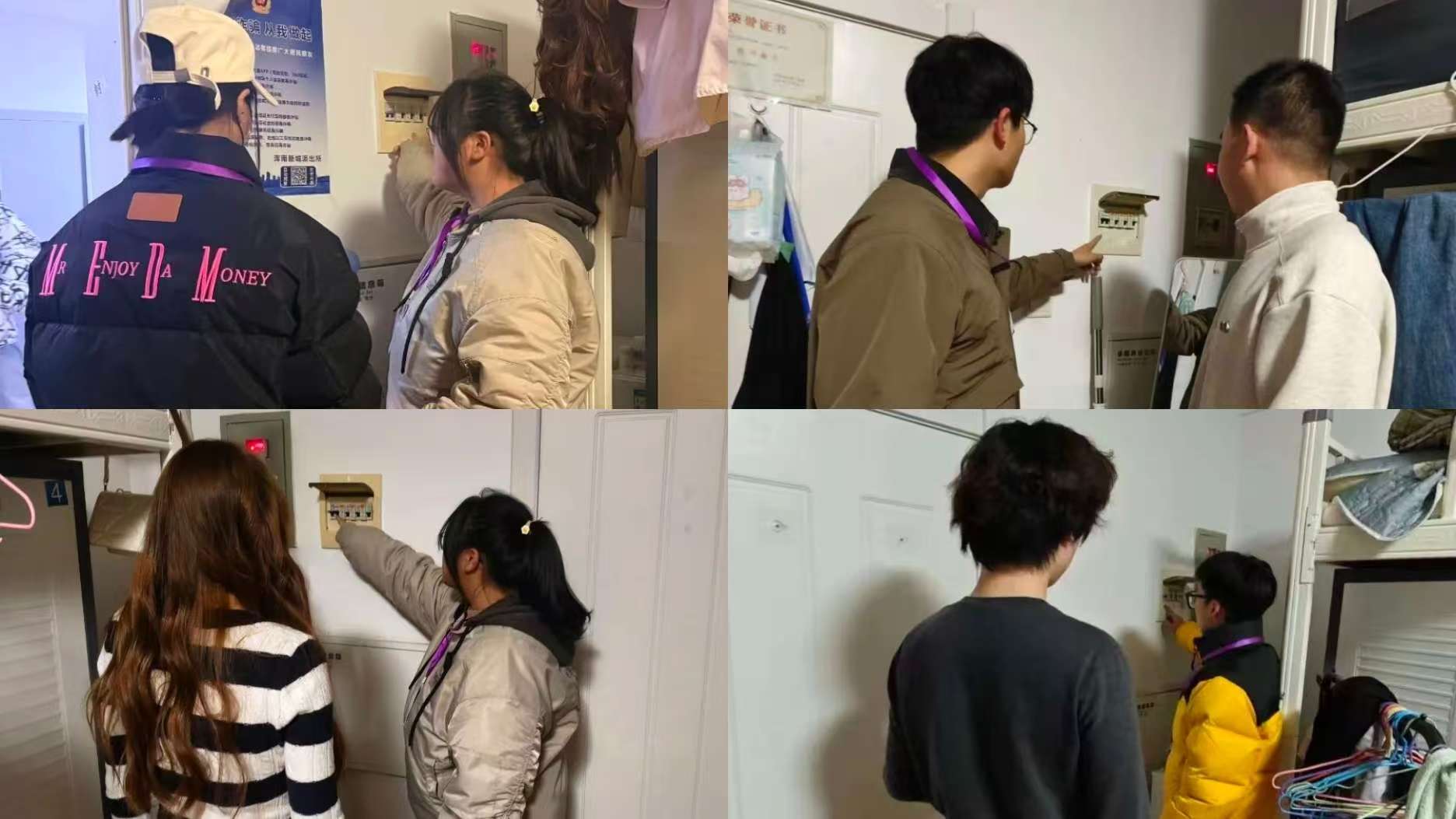 学生会成员深入学生寝室。他们不仅向同学们清晰讲解离寝前关闭总闸的重要性,更进行“手把手”的现场演示: