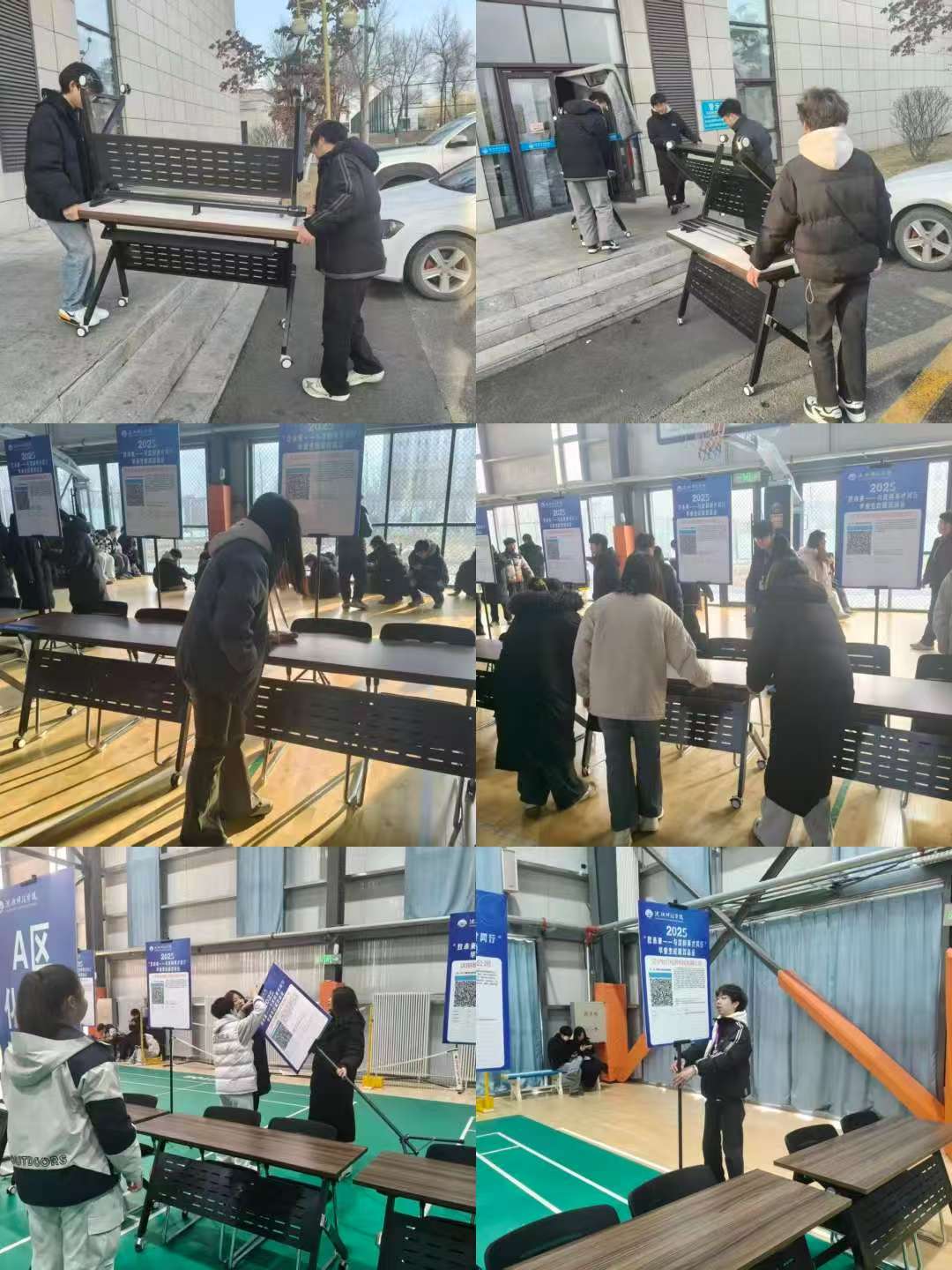 双选会前日,风华体育馆内已是一片繁忙。伟德国际victor1946的学生志愿者们早早投入会场布置工作。搬运物资、整齐摆放桌椅、悬挂指引标识、划分功能区……他们一丝不苟,确保每一个展位清晰明了,每一条通道安全畅通。