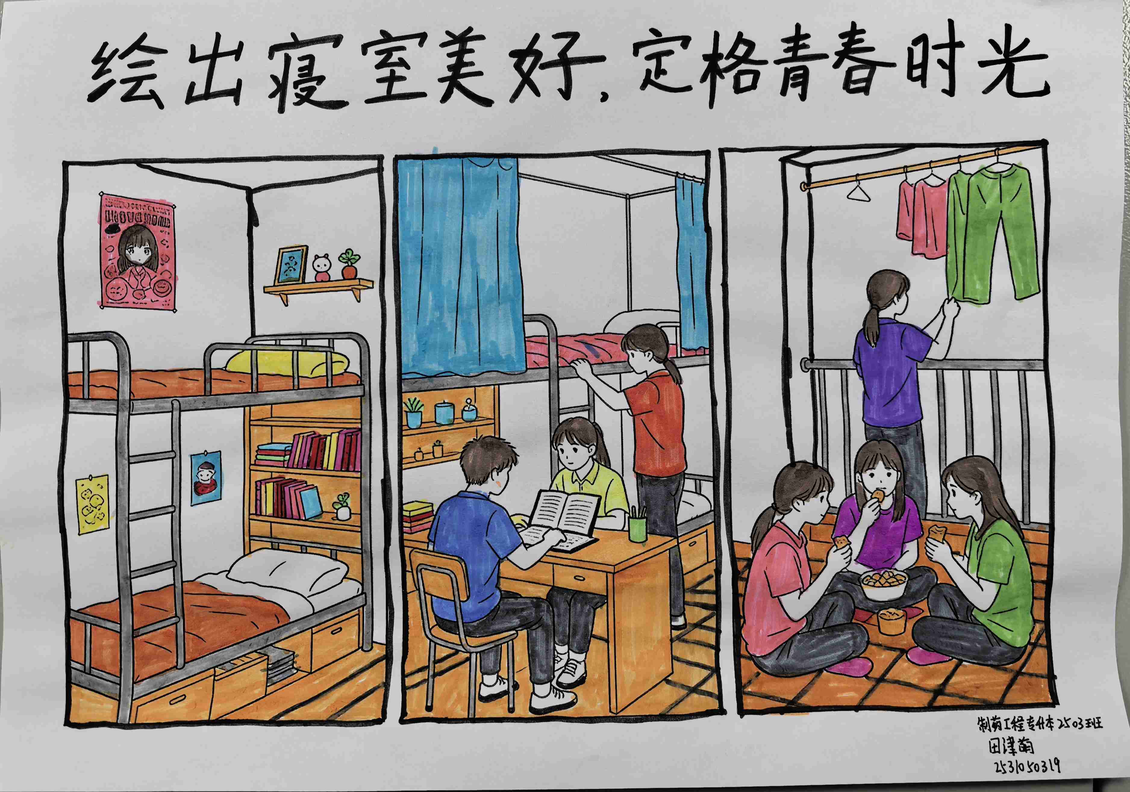 本次寝室文化节绘画大赛,不仅为同学们提供了展现艺术才华的平台,更以寝室为纽带,深化了室友间的情感联结,培育了团队协作与集体凝聚力,打造了富有艺术气息、积极向上的寝室文化环境。