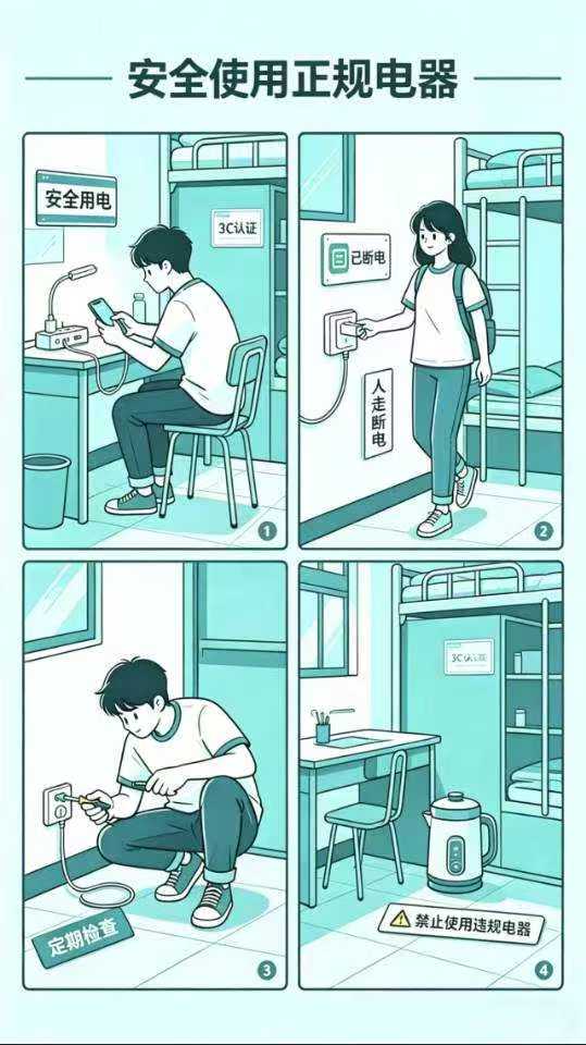 1. 日常选购宿舍用电设备时,务必认准带有国家3C强制安全认证标识的产品,坚决拒绝做工粗糙、无生产厂家、无质量合格证、无安全认证的“三无”用电产品,一定要从商场、官方旗舰店等正规渠道选购电器,从源头规避用电安全隐患;