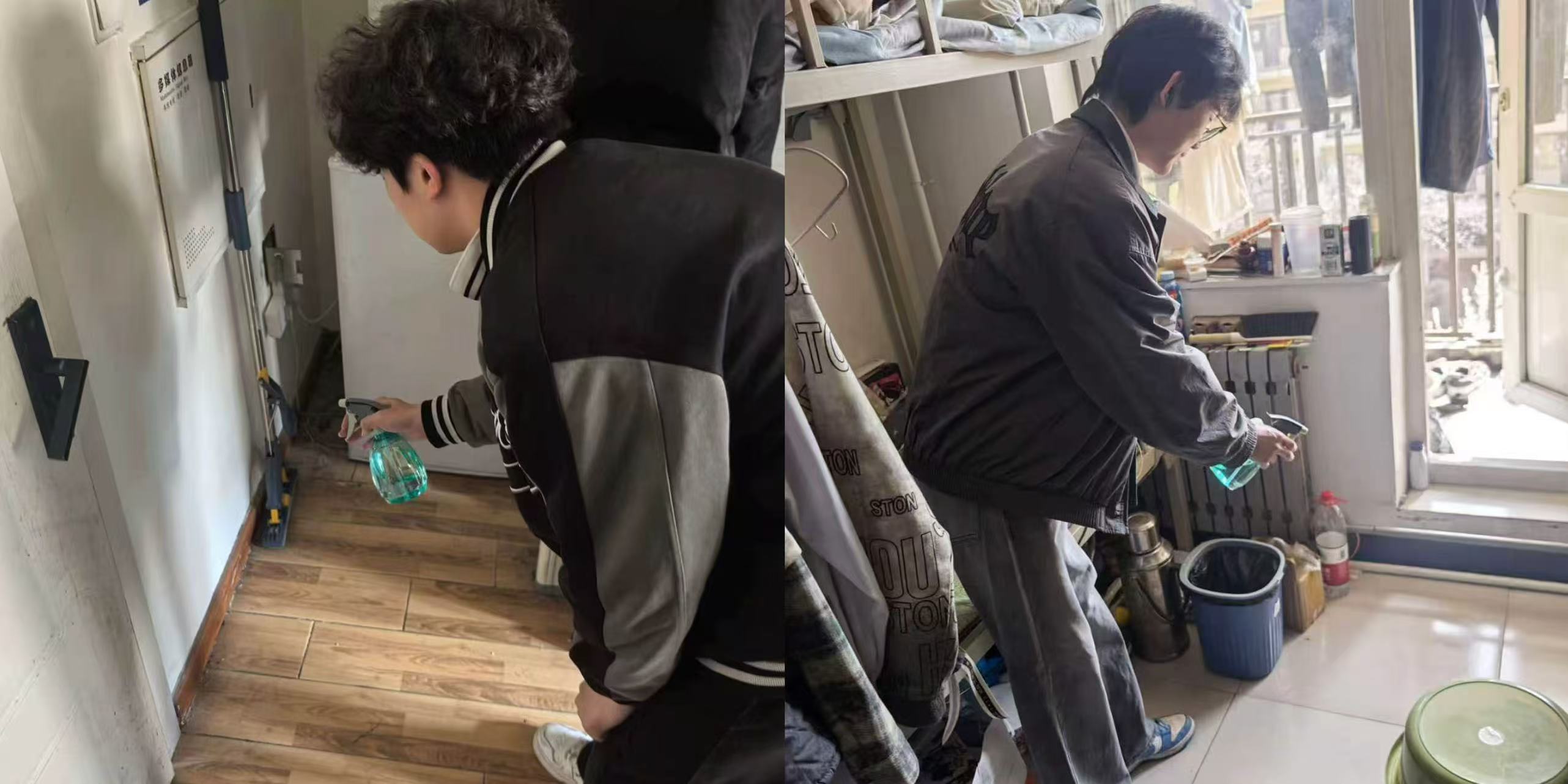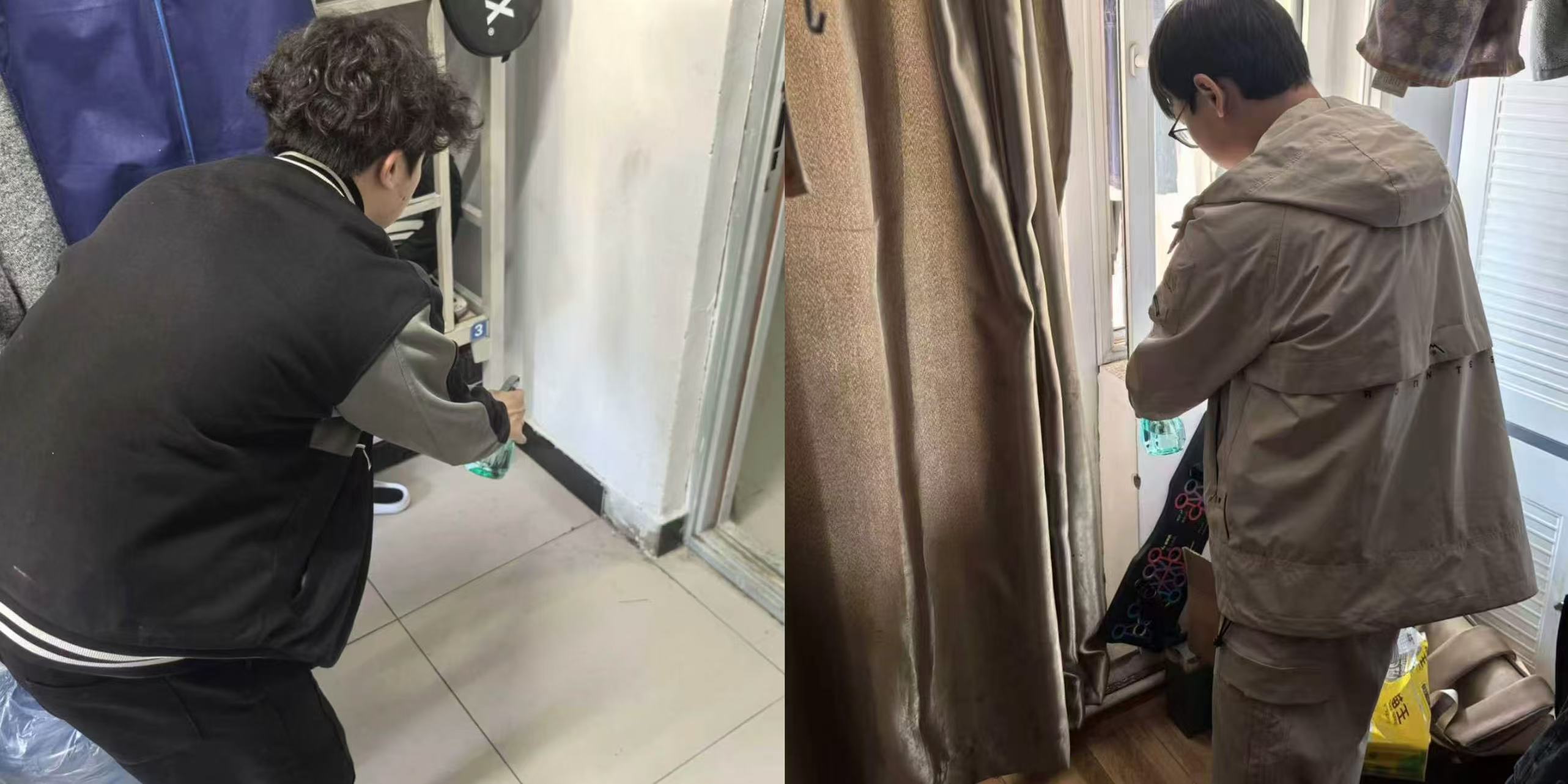 从地面、墙面,到书桌、衣柜、床架,再到门把手、开关、阳台等高频接触区域和卫生死角,大家认真喷洒、细致擦拭,不放过任何一处病菌易滋生的地方。消毒过程中,工作人员规范操作、耐心细致,在完成消杀工作的同时,也贴心提醒同学们及时开窗通风、整理内务,保持寝室空气流通,养成良好的生活卫生习惯。
