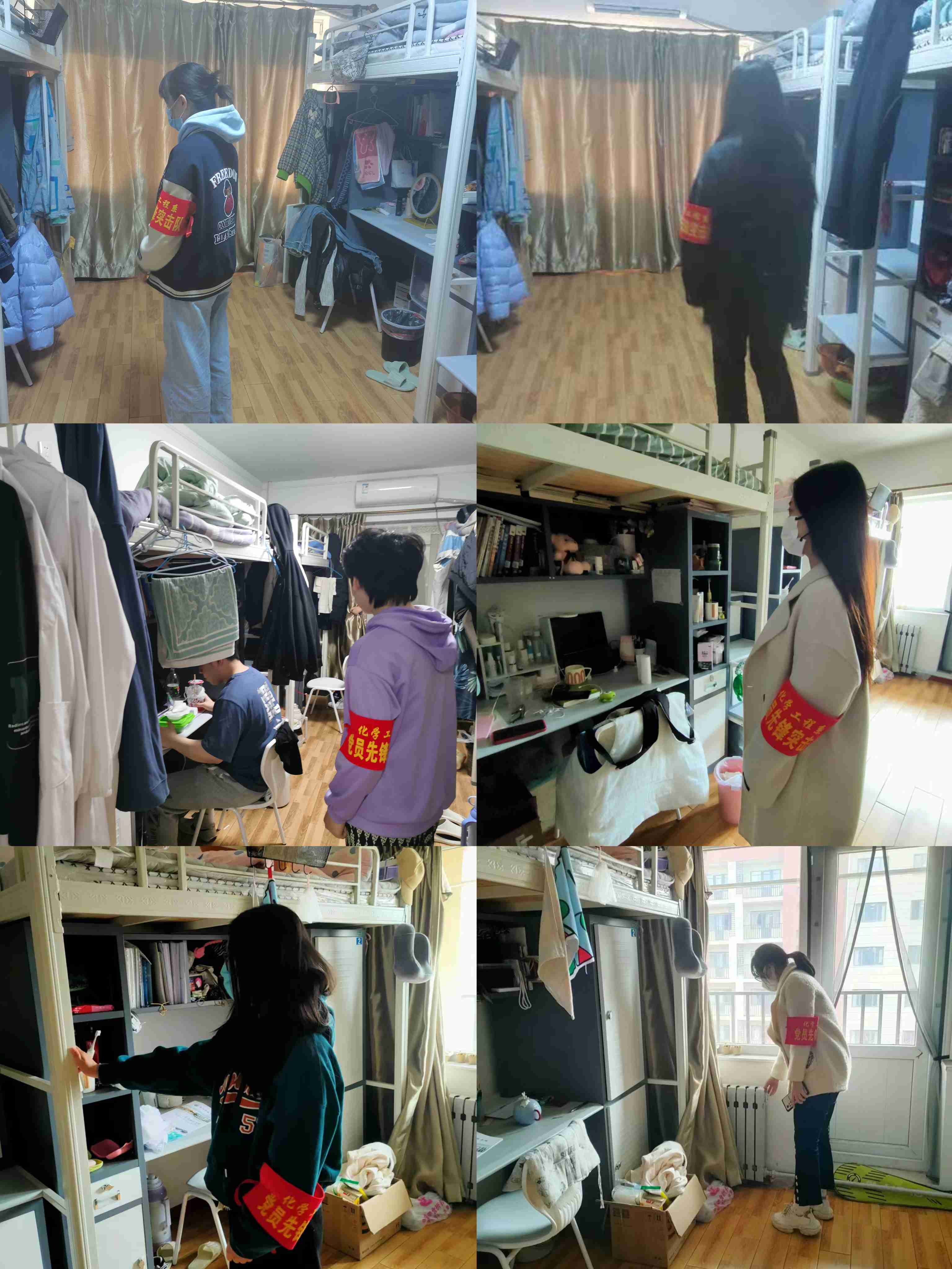 学生党员深入学生寝室进行检查工作,本次检查主要包括卫生情况与安全隐患两个方面,检查了学生宿舍的卫生清洁程度、内务整理情况;重点排查了宿舍内是否存在违规使用电器、抽烟及私拉乱扯电线等情况。旨在帮助学生养成良好的卫生习惯,加强良好宿风建设。