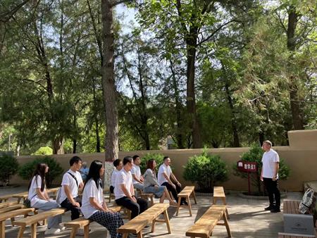 在中共七大会址——杨家岭中央大礼堂门口的柏树下,实践队全体成员怀着无比崇敬的心情进行了一次特殊的党史教育集体学习,大家紧跟习近平总书记的步伐,认真贯彻落实习近平新时代中国特色社会主义思想,使其成为当代青年人前进的行动指南,回顾党在延安时期的历史,挖掘党的七大精神、追忆毛泽东思想的形成过程,坚持党的优良作风,传承党的光荣传统,赓续党的红色血脉。