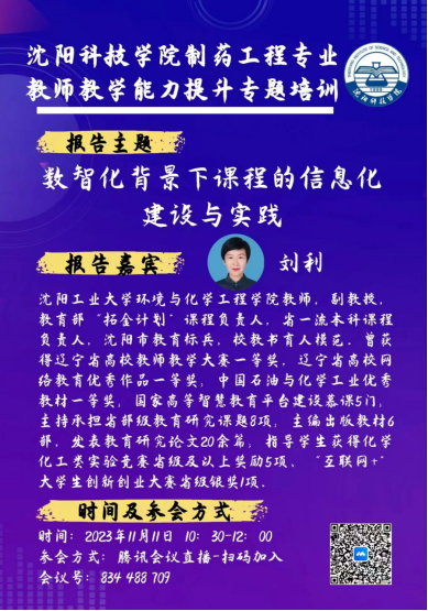 为提升教育教学能力,提高本科教学质量,伟德bv1946化学与化工系制药工程专业于2023年11月11日进行了线上培训活动。此次活动主讲嘉宾为沈阳工业大学环境与化学工程学院教师刘利副教授与张进副教授。沈阳工业大学环境与化学工程学院院长张林楠,伟德bv1946化学与化工系主任吴静,伟德bv1946化学与化工系各教研室主任全程参与培训活动,活动由制药工程教研室主任何鑫主持。