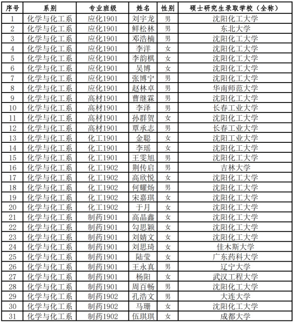 化学与化工系2023届毕业生191人,共考取硕士研究生31人,升学率达到16%,在当年全校升学率占比39%,连续10年高居全校各系部升学率第一,考取院校质量呈逐年上升趋势。在系部广大教师的悉心指导下,历届考研学子矢志不渝,力争上游,结出累累硕果,为广大学生树立了良好榜样,为系部高质量就业贡献了自己一份力量。