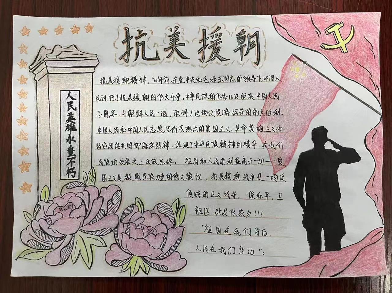 本次活动旨在通过创意和艺术的表达,展示大学生对抗美援朝战争的理解和对爱党爱国精神的传承。还能弘扬爱党爱国文化 ,传承抗美援朝的英勇精神,激发大学生们的爱国热情。此次活动同学们踊跃参与,热情高涨,他们用灵动的画笔、优美的文字展现出对抗美援朝战争先烈们崇高敬意以及对伟大祖国美好前景的祝福。一张张精美的手抄报,是同学们对英雄的缅怀,对祖国的热爱。
