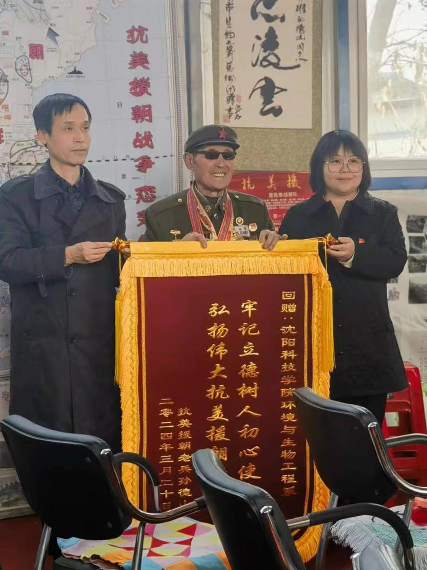 为表达崇高的敬意,环境与生物工程系党支部书记赵朋亮和环境与生物工程系主任刘慧两位老师代表环境与生物工程系全体师生赠孙德山老战士锦旗,授环生系锦旗并用《铭记》一书进行签字留念。