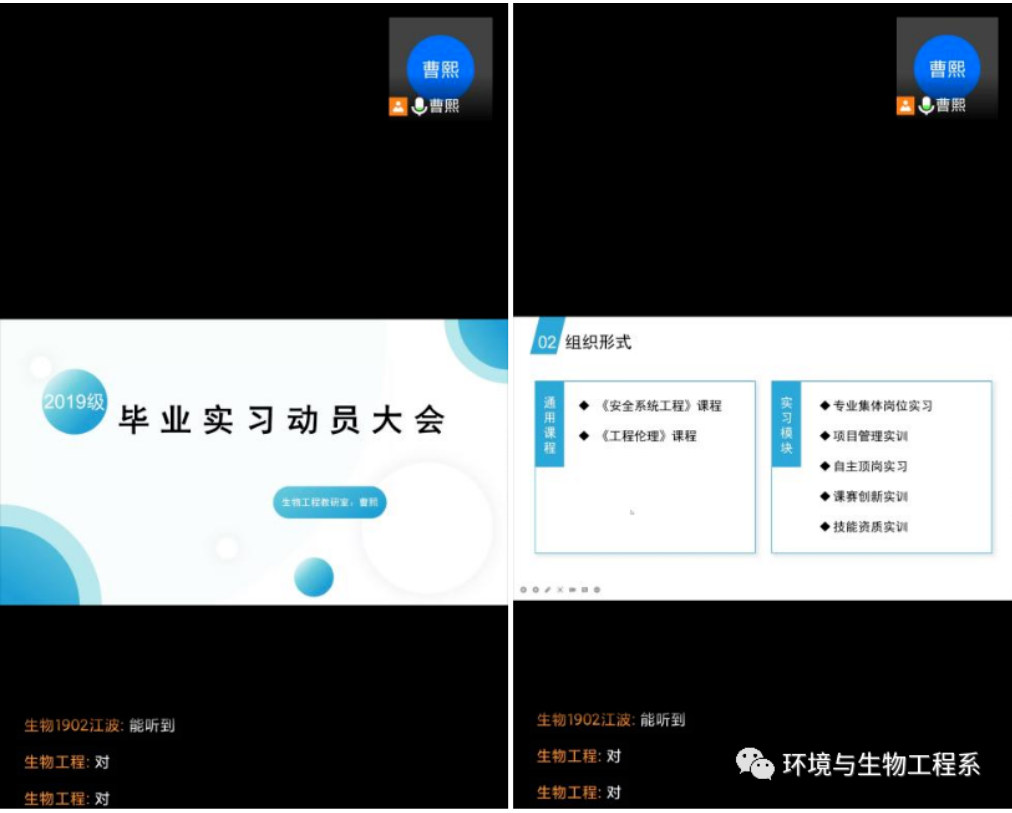 2022年6月1日11:00举行了环境与生物工程系生物工程专业2019级本科毕业生毕业实习动员会。为做好疫情防控,考虑为北校区的同学们提供便利,该会议线上腾讯会议,线下二教322教室同时进行。会议由生物工程教研室的曹熙老师主持,2019级辅导员赵朋亮老师线下协助。