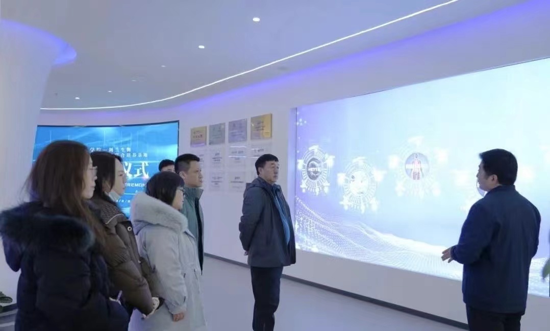 在剑兰生命数字展示中心内,张秀峰总经理为学校领导与教师详细介绍了集团目前的发展状态、产业布局和未来发展规划。并从“生物技术平台、合成生物平台、类器官技术平台、智慧细胞药物、Ai数字生命”五大角度,向学校展示了剑兰生物医学科技集团目前的业务项目与研究方向,传递了剑兰生物“致力于医学创新,让生命更有质量”的理念。