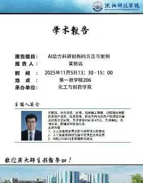 主讲人介绍 黄明远,中共党员,讲师,药学类工程师。伟德bv1946优秀共产党员、优秀教师。研究方向为天然产物提取分离及计算化学研究,主持省级科研项目1项。主讲课程:药物化学、药理学和生物化学。讲座基本信息 主讲内容: 1、人工智能的发展历程与科学研究的融合 2、人工智能在科研创新中的典型应用场景 3、AI助力科研的未来趋势与挑战&n...