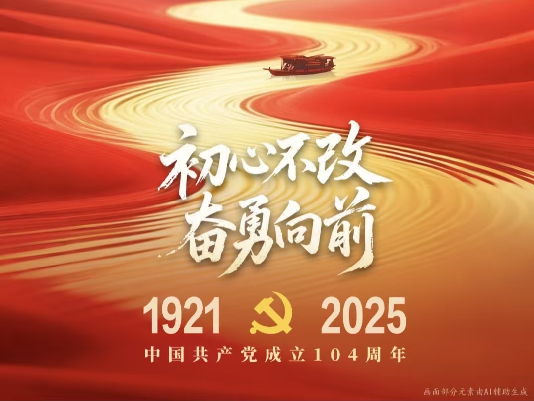 1921年,南湖红船劈开混沌一束微光点亮华夏百年后的今天当我们站在两个百年的历史交汇点回望那艘承载着民族希望的小船依然能听见信仰的浪潮奔涌不息从石库门到天安门从兴业路到复兴路中国共产党用104年光阴书写了一部壮丽史诗从1921到2025岁月见证初心奋斗成就辉煌以信仰之光照亮前行路祝福党的104岁生日 祝福伟大的祖国!红船精神永不褪色初心使命历久弥新让我们以信仰为舵以奋斗为帆在新时代的浪潮中传承红色基因续写......