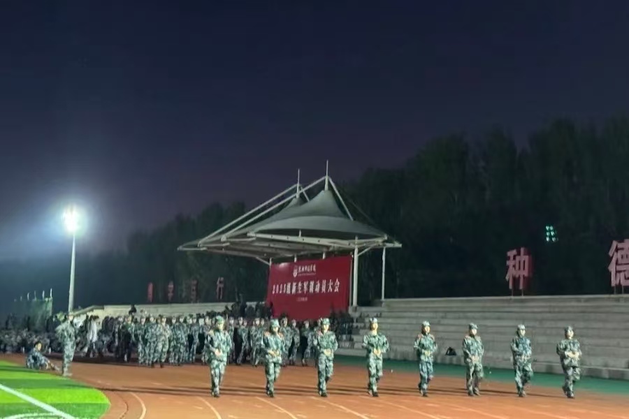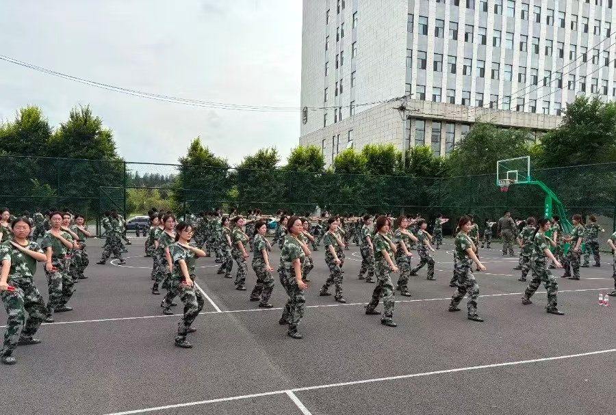 队列训练是军训的基础科目,看似简单的“站军姿”“走正步”,却最能体现纪律意识与团队精神,是“塑形”更“塑魂”的训练。“站军姿”时,学子们头顶烈日,保持“两脚跟靠拢、两脚尖外分60度、挺胸收腹、两眼平视”的姿势,目光坚定,即使汗水流进眼睛也保持不动;“正步走”训练中,专注打磨“踢腿高度15厘米、步幅75厘米、摆臂位置标准”,通过“分解练习——集体合练”反复校准动作。教官用尺子测量步幅、用绳子校准排面时,他们认真对照调整,力求每个动作都精准统一,用严谨态度展现“精益求精”的训练精神。