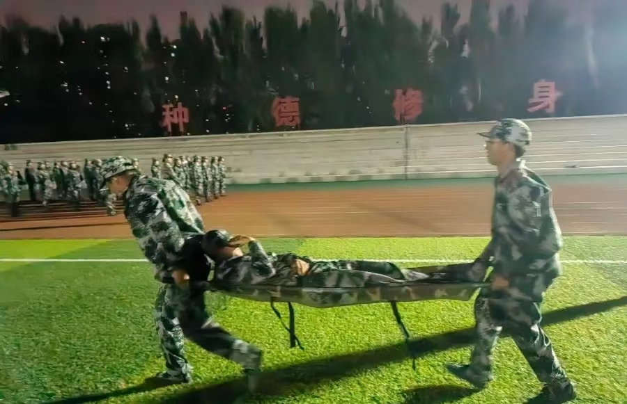 军训场上的热血拼搏,离不开医疗救护团队的默默护航,他们用专业与温情,为训练筑起“安全屏障”。军训医疗点内,穿白大褂的学生志愿者分工明确、有条不紊。有人蹲在地上,细致为训练擦伤的同学清创、涂药、包扎,动作轻柔且精准,边操作边轻声讲解护理注意事项;有人守在降温区,为烈日下训练的同学递上解暑饮品,用湿毛巾仔细擦拭额头,耐心普及防暑知识。正午时分,他们背着急救包穿梭在各个训练方阵,主动观察同学状态,遇有不适立刻上前帮扶,额角渗满汗珠却始终保持专注,用细致与负责诠释“哪里有需要,哪里就有白衣”的担当。