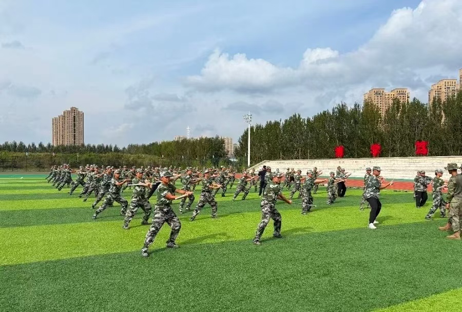 大刀术承载着传统武术与军事技能的融合,一招一式尽显力量与气势,是军训中极具观赏性与文化意义的科目。初握大刀,学子们便专注感受器械重量,从“劈刀”“斩刀”“撩刀”“架刀”等基础招式练起。为掌握发力技巧,他们扎稳马步练习“举刀定姿”,手臂发酸便稍作调整后继续坚持;为提升动作连贯性,主动向教官请教“腰马合一”的诀窍,课间与队友交流练习心得。训练场上,男生对着操场边缘反复打磨挥刀力度,女生专注调整动作角度,汗水浸透迷彩服后背也不停歇,从最初的“挥刀吃力”逐渐变得“招式娴熟”,每一次挥刀都带着十足气势。