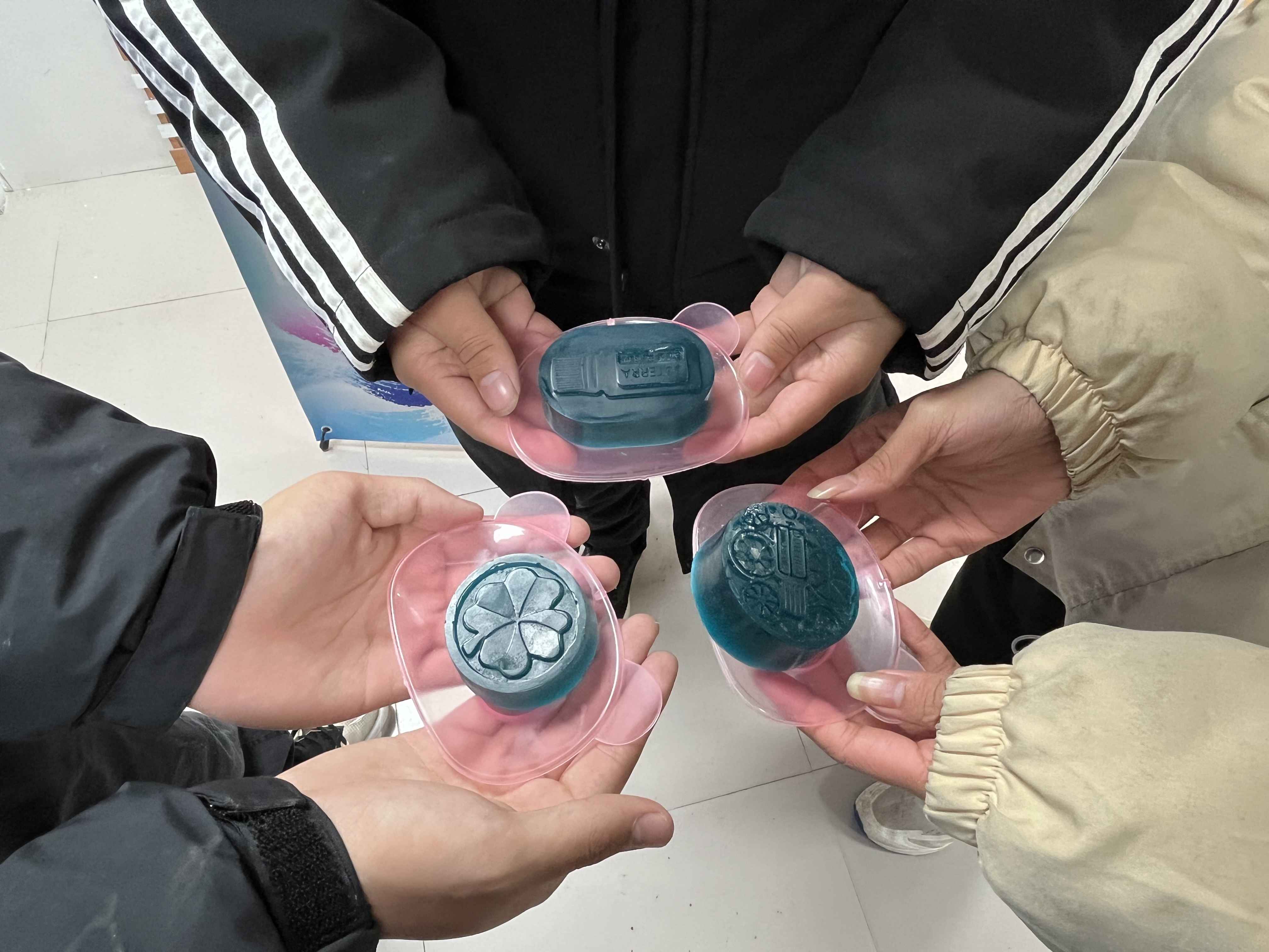 先熔化皂基,然后加入色素和香氛等材料,充分搅拌均匀后倒入模具中,经过约半小时的风干凝固后,最后脱模,一块块色彩缤纷、形状各异的环保手工香皂就完成了。看到一块块漂亮的DIY手工皂应运而生,大家在香气氤氲中,欢声笑语、收获颇丰。